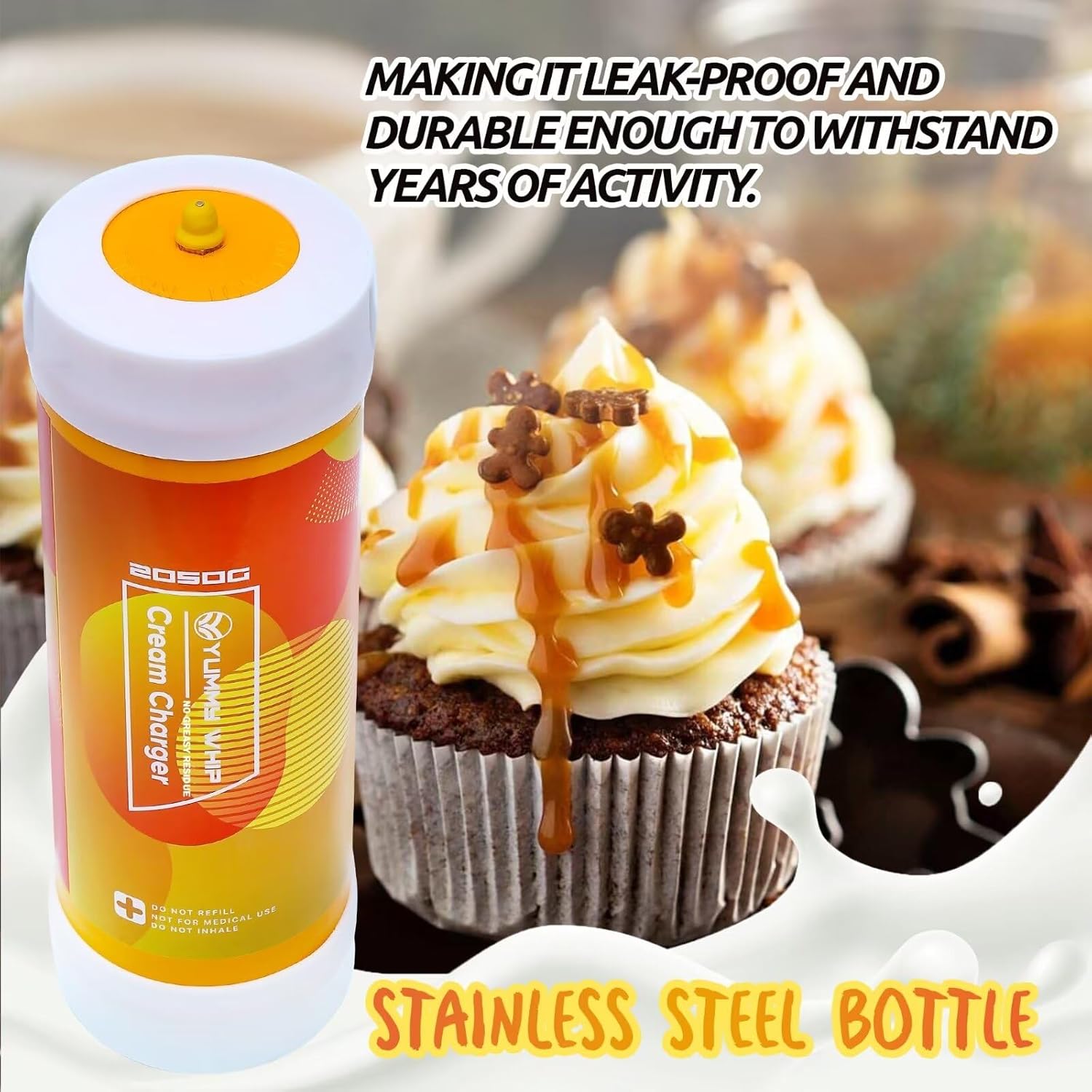 - Yummy Whip whipped cream dispenser charger is made of premium stainless steel, making it leak-proof and durable enough to withstand years of activity. Ensures long-lasting performance and safety. Trust in our premium quality tanks for your needs.
